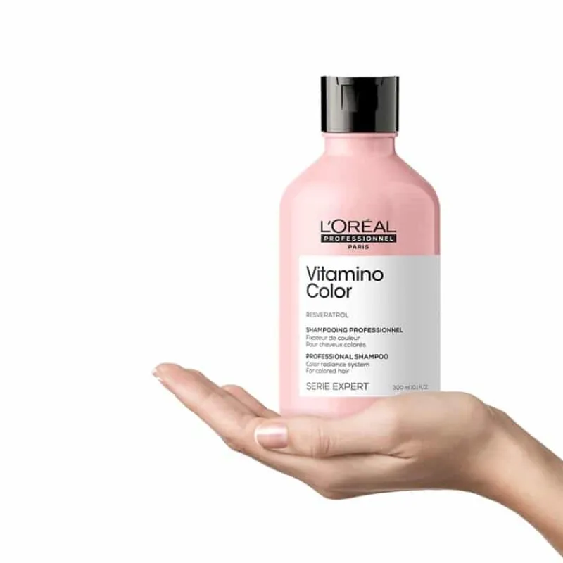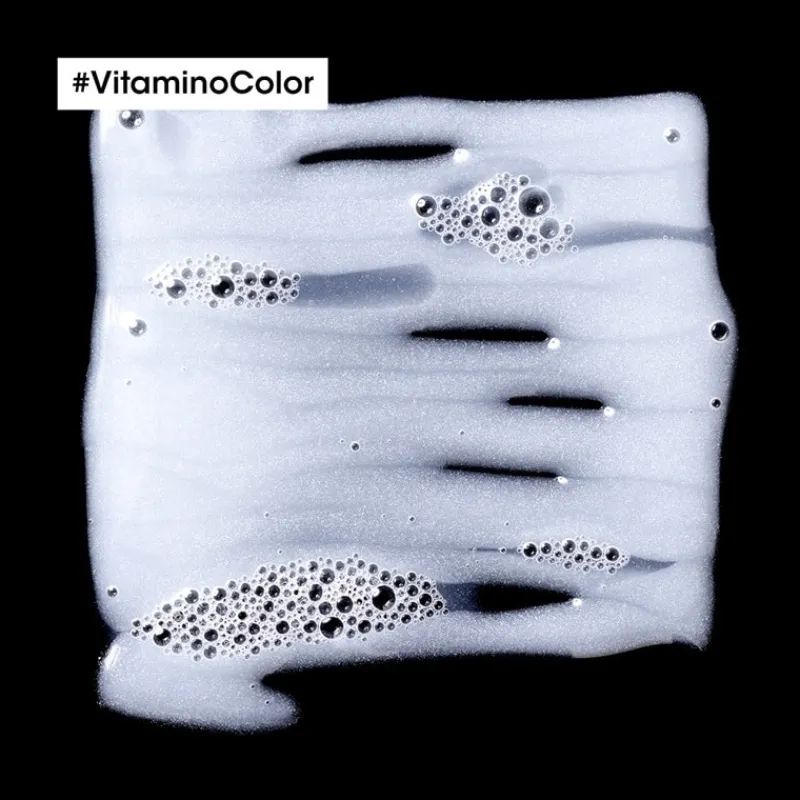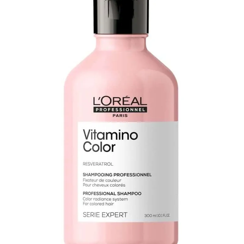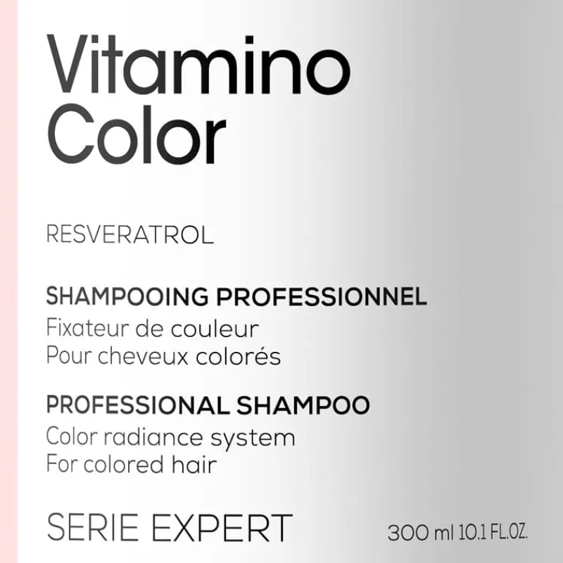 L’Oréal Professionnel Serie Expert Vitamino Color Shampoo er et sjampo for fargebehandlet hår. Sjampoen inneholder resveratrol og forhindrer at hårfargen falmer i opptil åtte uker. Samtidig beskyttes hårfibrene mot slitasje, og gir et perfekt og glansfullt resultat. Den fjerner forurensninger og gjør håret mykt fra rot til spiss.