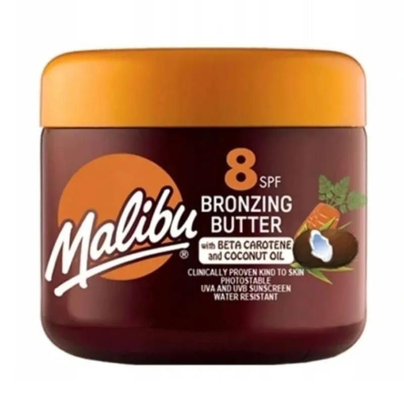 Malibu Bronzing Butter med Betakaroten og Kokosolje SPF8 er spesielt formulert med Betakaroten for å støtte hudens naturlige brunfarge ved å fremme hudens mørke pigment til overflaten. Denne næringsrike formelen vil etterlate huden strålende med Malibus berømte tropiske kokoslukt. Dette kroppssmøret fukter huden din med vitamin E, og holder den fuktig og myk, samtidig som det er vann- og svetteresistent. Lav UV-beskyttelse.