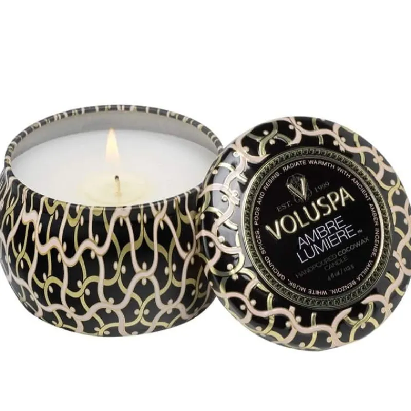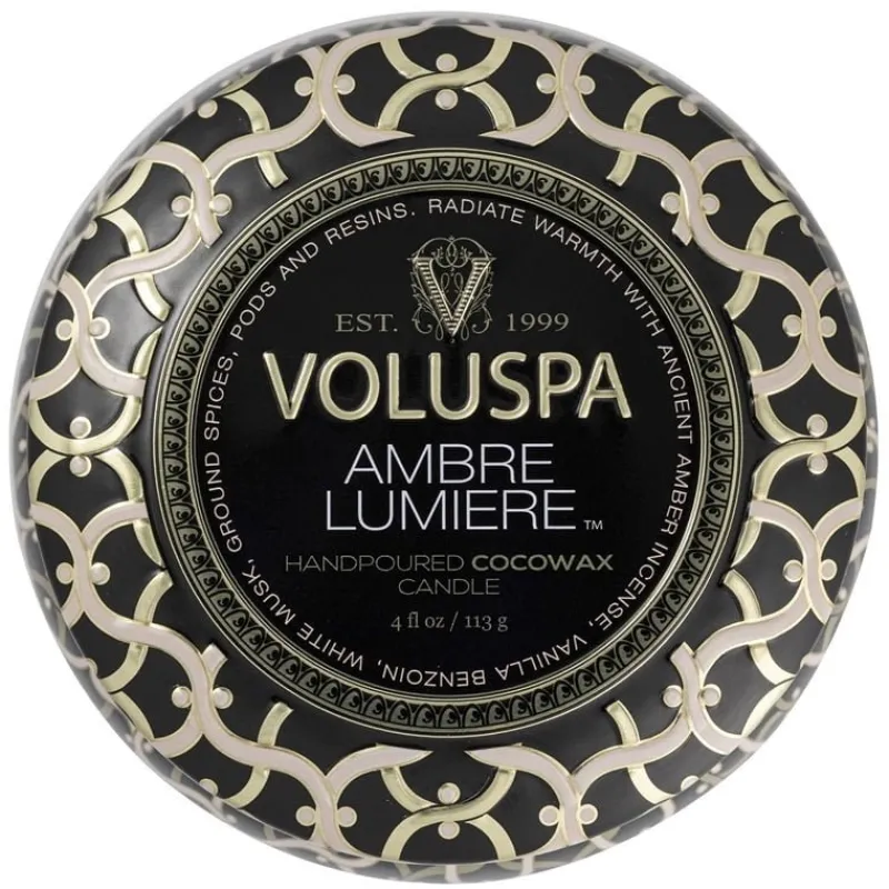 Voluspa Maison dekorative blikklys Ambre Lumiere 113g har en duft av rav, vanilje og indonesisk patchouli.