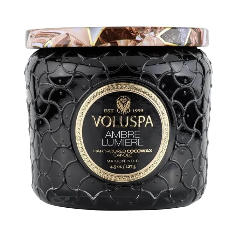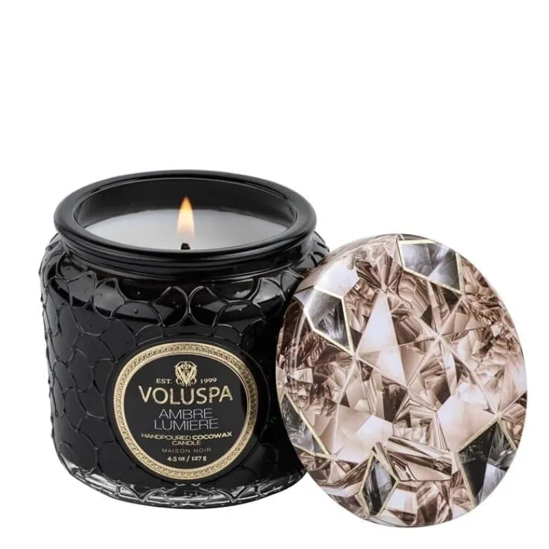 Voluspa Petite Jar Ambre Lumiere har duftnoter av ambra, edelt seremonielt brennende treä og vanilje. Den aromatiske utstrålingen til denne tidløse duften skaper en følelse av ro, åpenhet og velvære. Gjenspeil varmen hjemme og i ånden med Ambre Lumieres mystiske, meditative blanding.